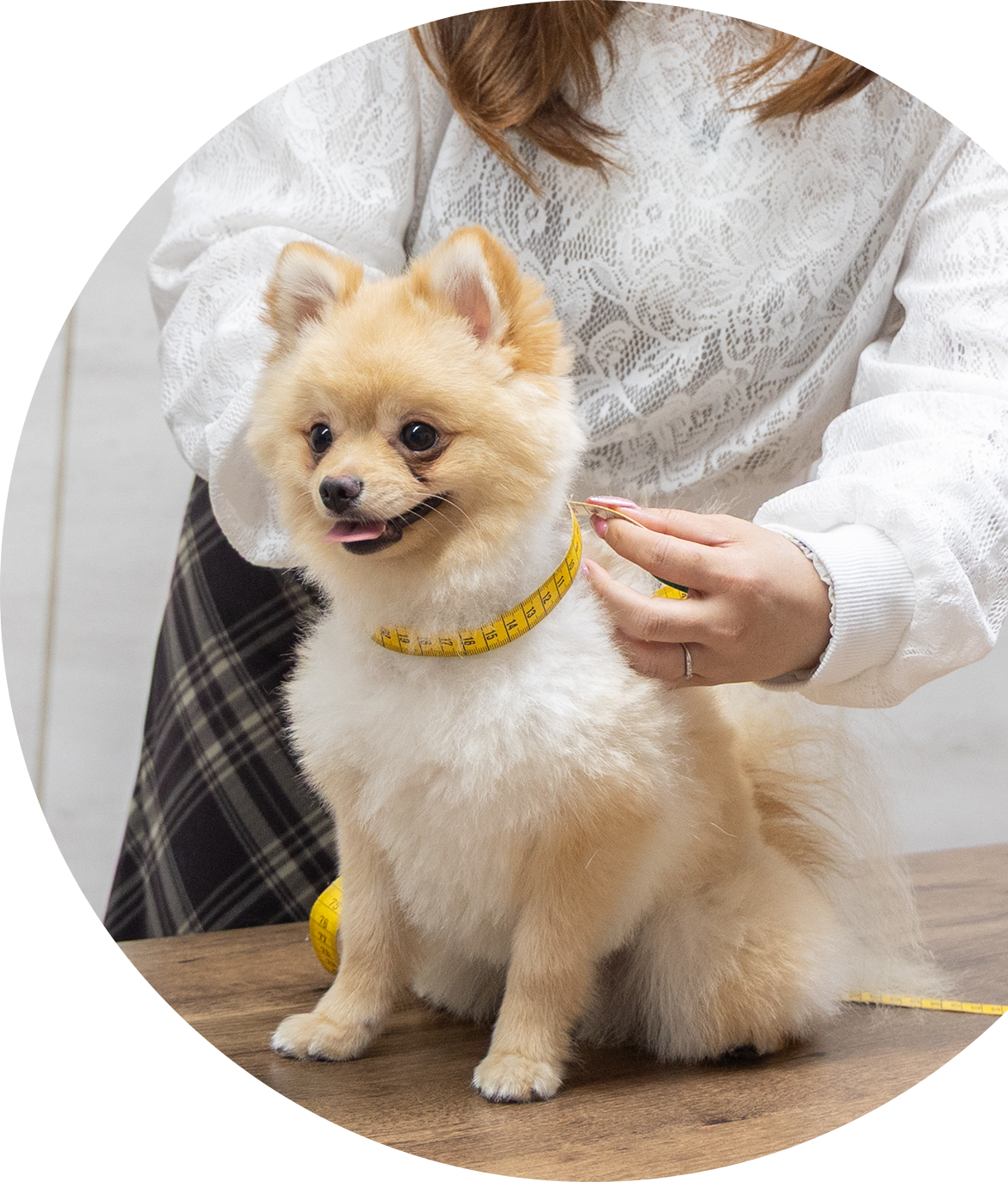 確かな技術をもとに、スタイル提案からフィッティング、型紙作成、縫製までをすべて自社で手がけ、気品と品質を兼ね備えた愛犬用スーツを形にしました。