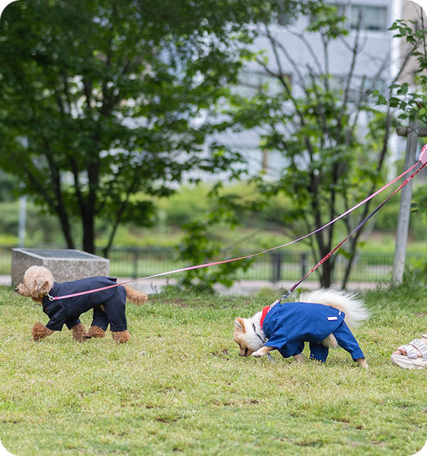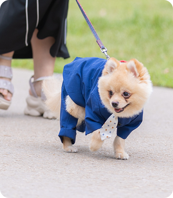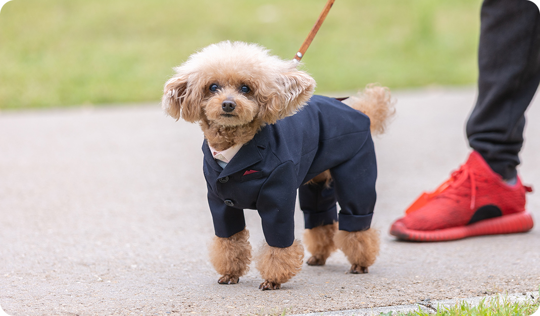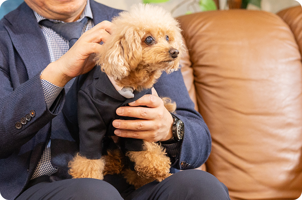 ワンちゃんがストレスを感じにくいよう細部にこだわった思いやり設計は、1年の歳月をかけて完成。飼い主様とお揃いのスーツルックを楽しめるのもオーダースーツ専門店ならでは。