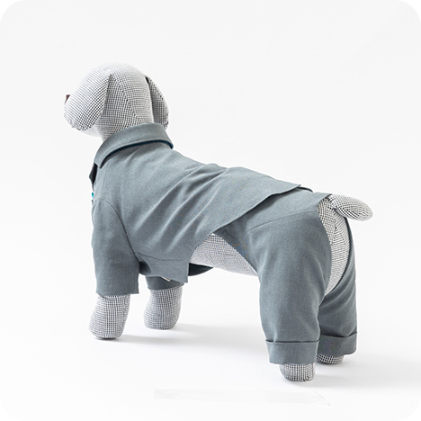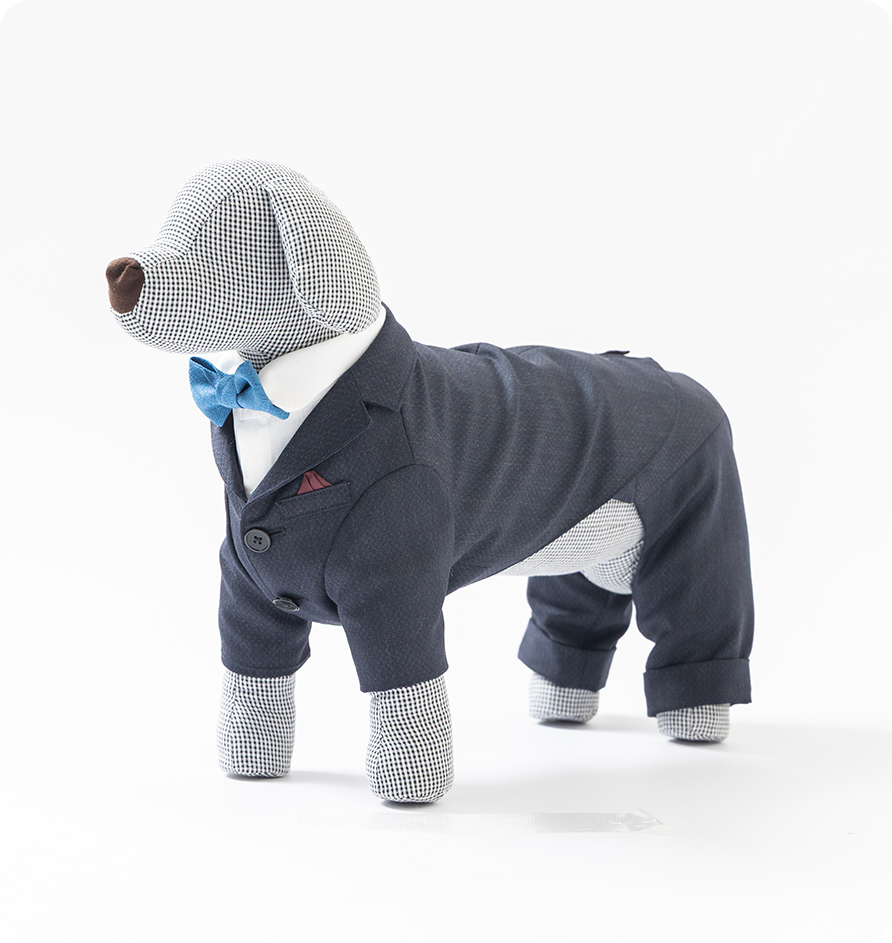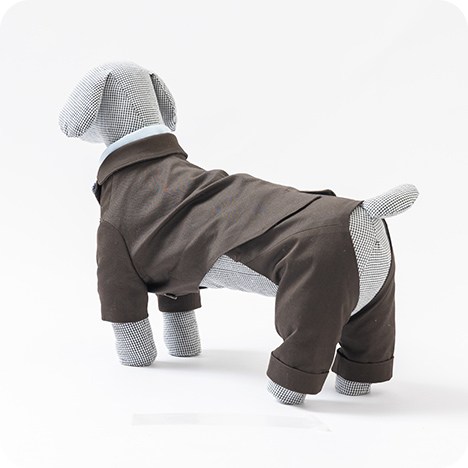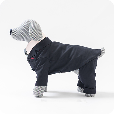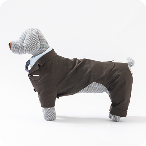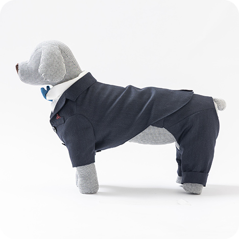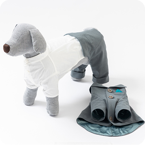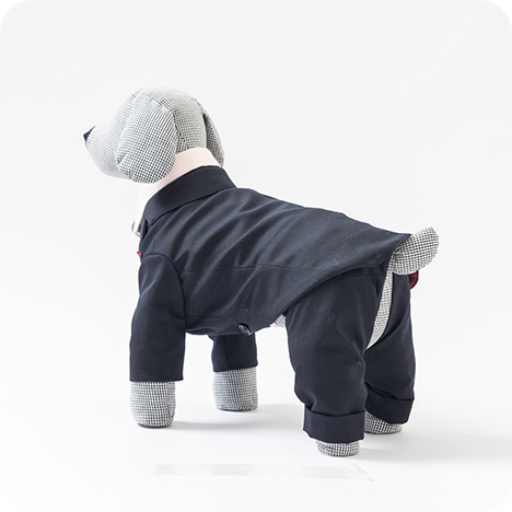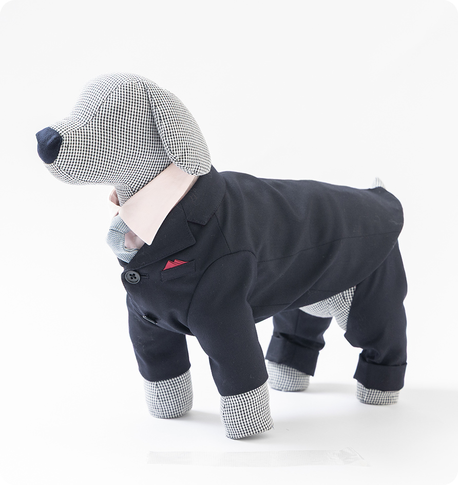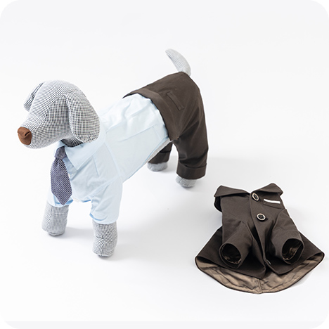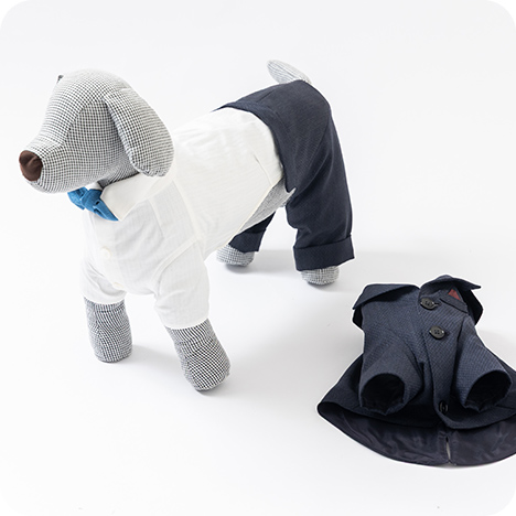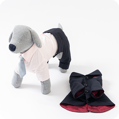 しかし、人のスーツづくりのノウハウだけでは解決できない課題が次々と浮上し、スタッフの愛犬たちにも協力してもらい試行錯誤すること約1年。ワンちゃんのどんな姿勢にも美しくフィットし、動きを妨げることのない立体設計を実現しました。