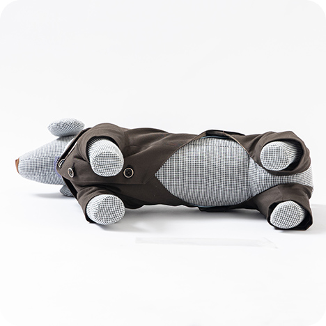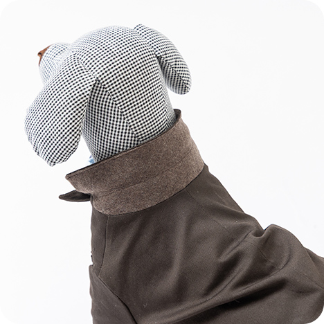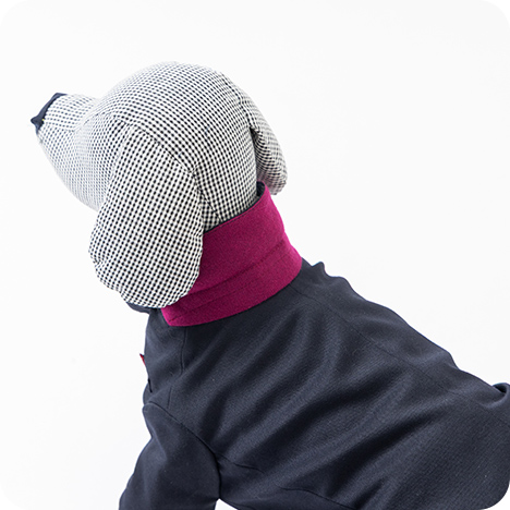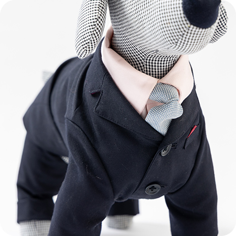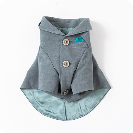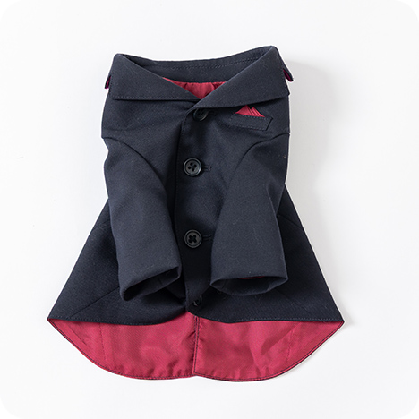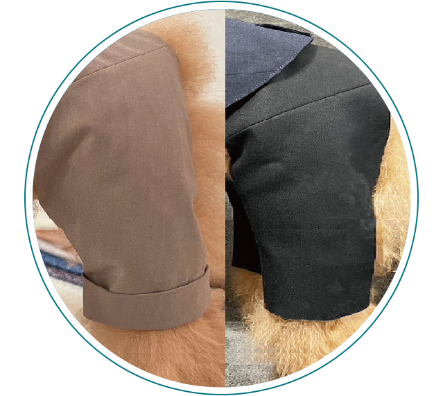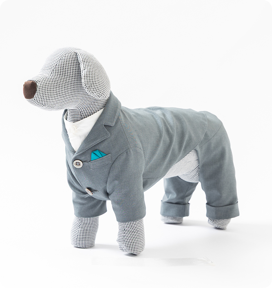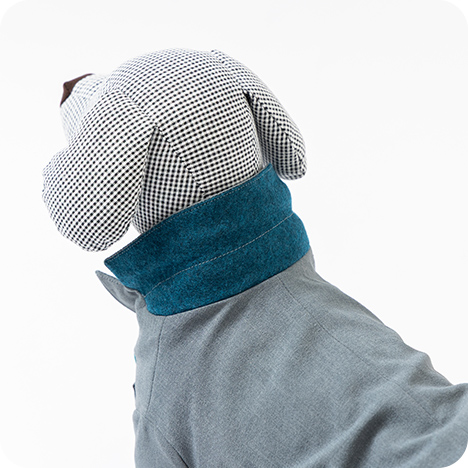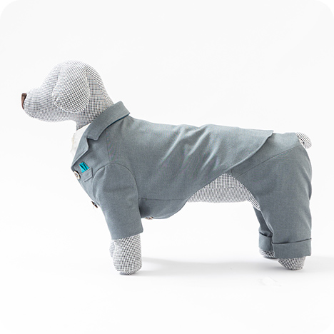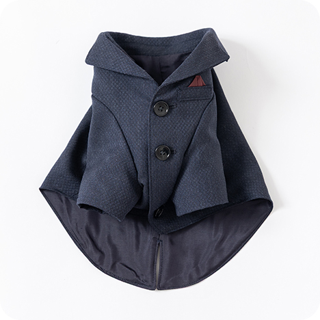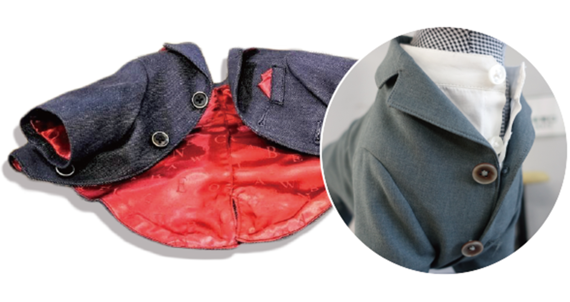 しかし、人のスーツづくりのノウハウだけでは解決できない課題が次々と浮上し、スタッフの愛犬たちにも協力してもらい試行錯誤すること約1年。ワンちゃんのどんな姿勢にも美しくフィットし、動きを妨げることのない立体設計を実現しました。